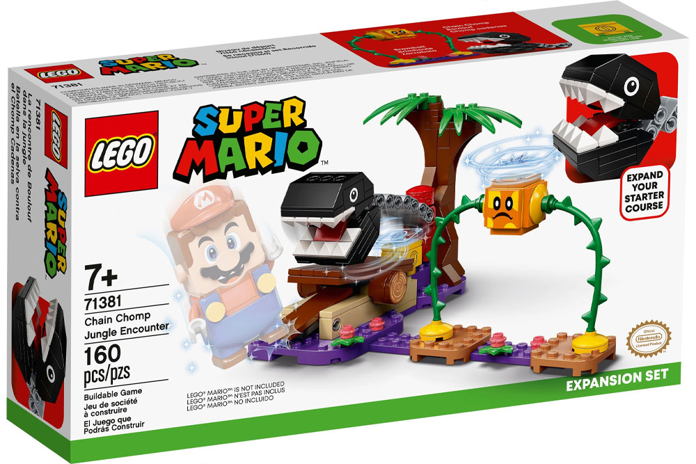 - Das Erweiterungsset „Begegnung mit dem Kettenhund“ (71381) lässt Kinder eine Sprungherausforderung im Limonadendschungel zu ihrem LEGO® Super Mario™ Starterset hinzufügen. Diese witzige Aufgabe können sie dann mit ihren Freunden meistern.